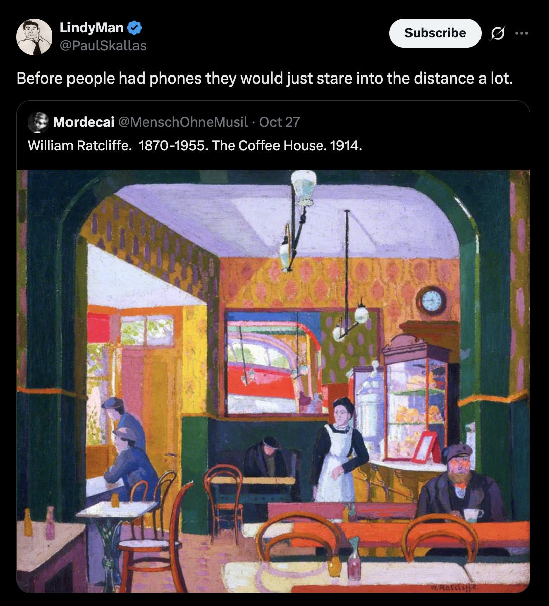 But I lose myself in the phone, too. I scroll for hours, completely consumed—the same narrowing, the same vanishing of self. But the quality of that disappearance is different. The phone collapses attention inward; the world recedes until there’s only stimulus. The dishes, by contrast, open something up. The same self-forgetting, but with space instead of compression. The phone leaves me depleted; the dishes leave me calm. The bar leaves me human.