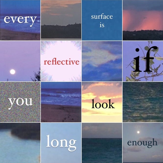 She thinks about how funny it is that standing still in public is perceived as a crisis, a rupture in the social contract. That one is expected to rush frantically from point to point, which is considered not just normal but virtuous. Productivity as pathology, motion as madness, but nobody can see it because we’re all moving too fast. But motion is not synonymous with productivity. She feels plenty productive right now.